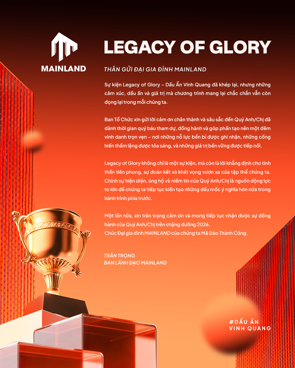Sự kiện Legacy of Glory đã chính thức diễn ra trong không khí trang trọng và giàu cảm xúc, với sự tham dự của Ban Lãnh đạo cùng toàn thể đội ngũ MAINLAND. Đây là một trong những sự kiện nội bộ nổi bật, đánh dấu cột mốc quan trọng trên hành trình xây dựng và phát triển thương hiệu MAINLAND.